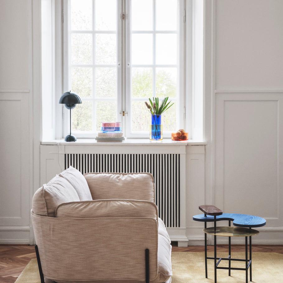 The &Tradition VP3 table lamp, also known as the Flowerpot VP3, is an iconic design by Danish designer Verner Panton. Originally created in 1968, this lamp embodies the spirit of the Flower Power movement with its playful and modern aesthetic. The lamp features two hemispheres facing each other, creating a distinctive and harmonious shape, with a base made of lacquered metal that complements the overall design. Crafted from spun metal, it has a sleek and durable finish. The lamp is compact, making it suitable for desks, tables, and other small spaces. Celebrated for its timeless appeal, the Flowerpot VP3 adds a touch of elegance and fun to any room.